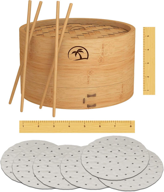Bamboo Steamer Set with 2 Tiers, 8-inch Basket, Lid, Dumpling Steamer, Chopsticks, Perforated Liners - Easy to Clean for Cooking Rice/Vegetables