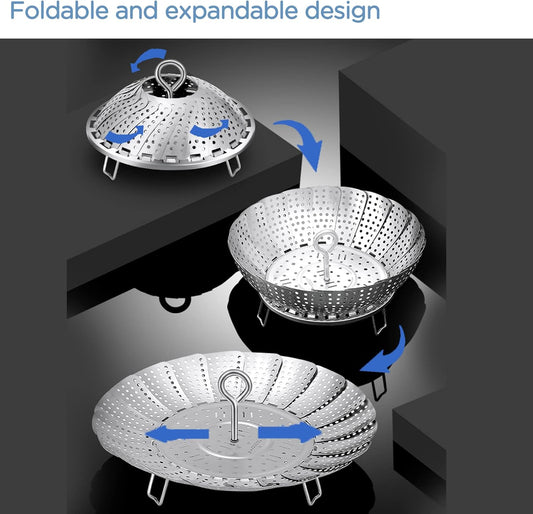 Expandable Vegetable Steamer Basket Set - 304 Stainless Steel Steamer for Cooking, Fits 5.7" to 9" Pots with Included 7.3" Kitchen Tong