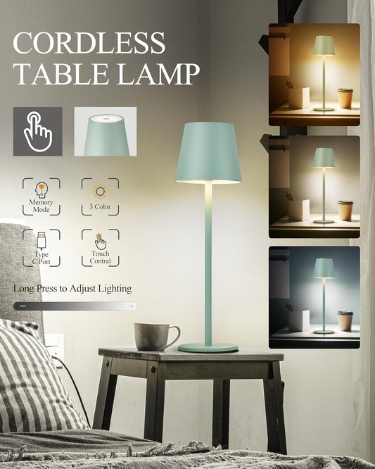 2Pack Cordless Table Lamp with 5200mAh Rechargeable Battery - Waterproof Desk Lamp with 3 Color Dimming, Battery Operated for Kitchen, Outdoor, Restaurant, Camping - Matcha Green