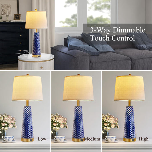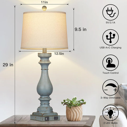 Set of 2 29" Coastal Bedside Lamps with USB Ports & AC Outlet, 3-Way Dimmable Touch Control Retro Blue Desk Lamp for Living Room and Bedroom