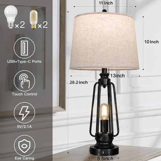 Set of 2 Vintage Metal Table Lamps with USB and Type-C Ports, 3-Way Dimmable Desk Lamp for Living Room and Bedroom - 28 inch Night Light with 4 Bulbs
