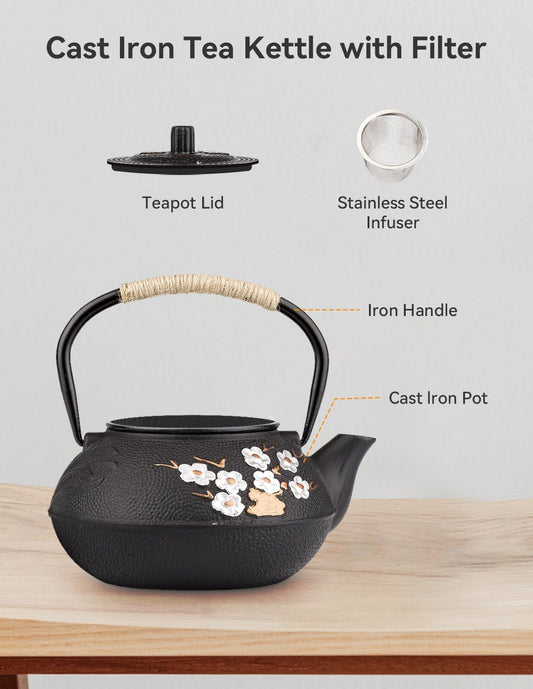Japanese Plum Blossom Cast Iron Teapot with Infuser - Stovetop Safe Enameled Tea Kettle 10.14oz/300ml