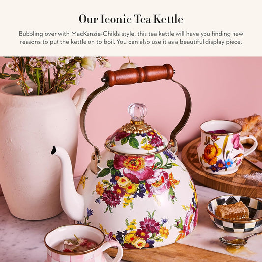 MACKENZIE-CHILDS White Flower Market Enamel Tea Kettle - Stylish 3 Quart Stovetop Tea Kettle
