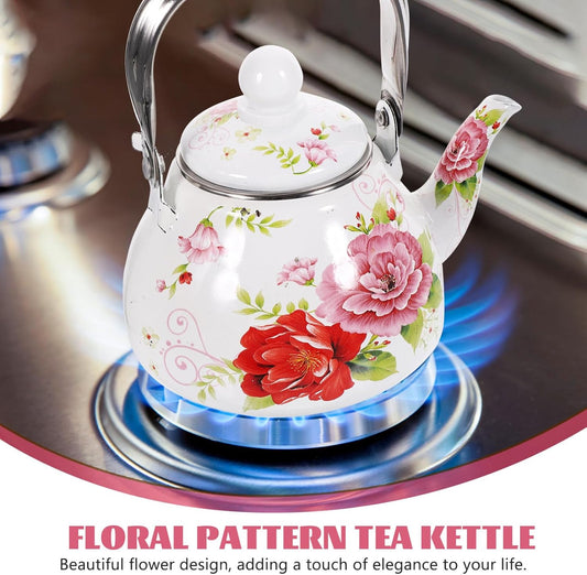 Vintage 3.2 Quart Stainless Steel Tea Pot for Stovetop - Whistling Pink Floral Kettle with Wooden Handle