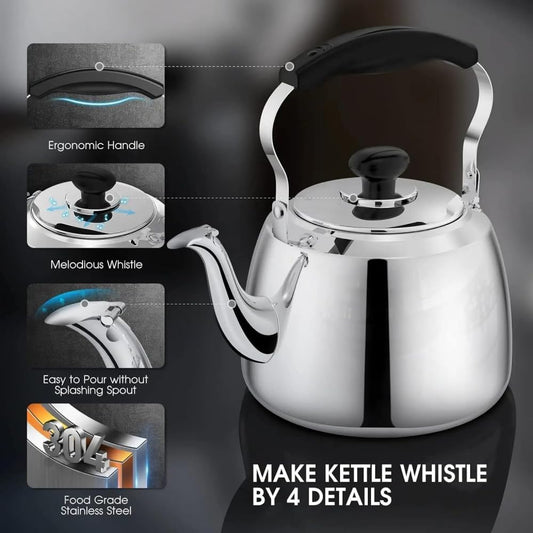 Kwnces Stainless Steel Whistling Tea Kettle for Stove Top - Ideal for Gas, Induction, Electric Stovetops - 4L Size