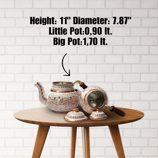 Handcrafted Antique Floral Turkish Copper Teapot Set with Wood Handle and Lid - Vintage Traditional Design for Gas and Electric Stovetops