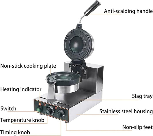 Stainless Steel Round Waffle Maker Machine - Non-stick Electric Waffle Iron for Bakery, Restaurant, Snack Bar - 1200W 110V